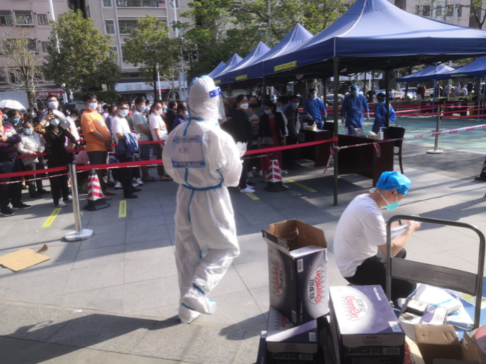 2022年1月7日,刚抵达中国科公司大学深圳医院的实习队伍还未来得及休整便面临了挑战——疫情爆发。刘翔、张颐、刘琪平、李振阳、陈娃宜几位同学接到老师的通知后便进行了穿脱防护服和采样流程的紧急培训,之后就前往各个社区、商场等地为市民进行核酸采样。从1月到3月,几位同学多次出勤,每次采集时间超过五个小时,个人累计采集人数上千人。在炎热的天气下穿防护服更是让大家酷热难耐,但是几位同学毫无怨言,工作辛苦时互相加油打气,为彼此增添动力。当看到商铺关门,原本繁华的街道变得冷冷清清时,那份责任感更是涌上心头,使得几位同学更加努力工作,为深圳的成功“摘星”做出了自己的一份贡献,也展现了南华公卫人应有担当。