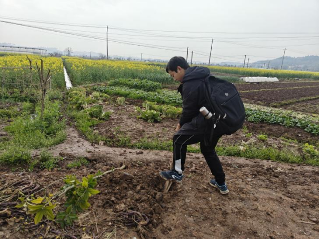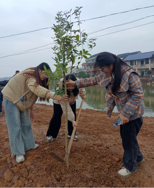 活动当日,志愿者们热情高涨,一抵达新桥村就迅速投入到植树工作中。他们分工明确,有的分拨树苗,有的挥锹铲土,还有的扶苗填坑。每一个步骤都认真细致。尽管过程中大家脚踩着泥泞的土地,鞋和裤子上都沾满了黄色的泥巴,但脸上始终洋溢着笑容。
