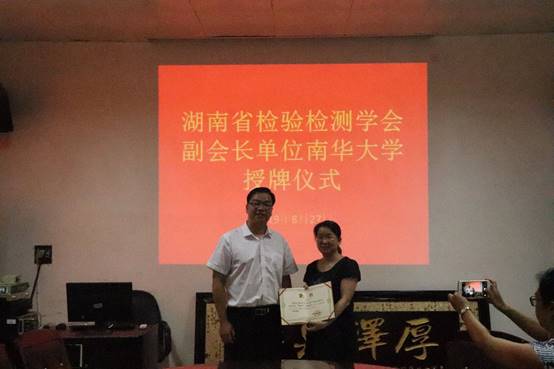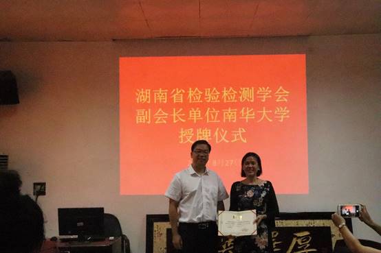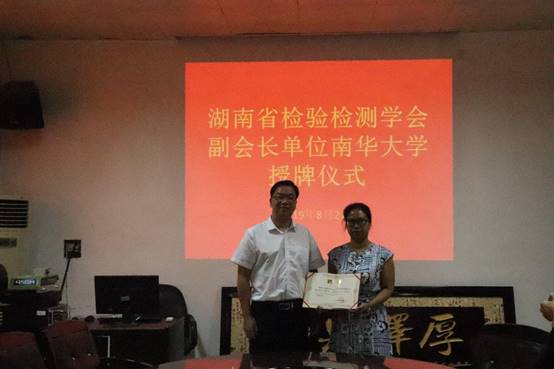 2019年8月27日上午,湖南省检验检测学会vsport胜利因您更精彩副会长单位授牌仪式在vsport七教一楼学术报告厅举行。授牌仪式由vsport经理龙鼎新主持,湖南省检验检测学会常务副会长兼秘书长陈祥光,湖南省检验检测创新联盟副秘书长欧庭蔚,湖南省检验检测学会秘书处李娜、聂日琼,vsport副经理李乐、副经理杨慧仙、教学科研办主任于军晖、卫生检验与检疫系主任陈丽丽、卫生检验与检疫系支部书记杨胜园、预防医学实验中心支部书记刘金权以及公司从事卫生检验与检疫专业教学科研的相关教师参加了授牌仪式。