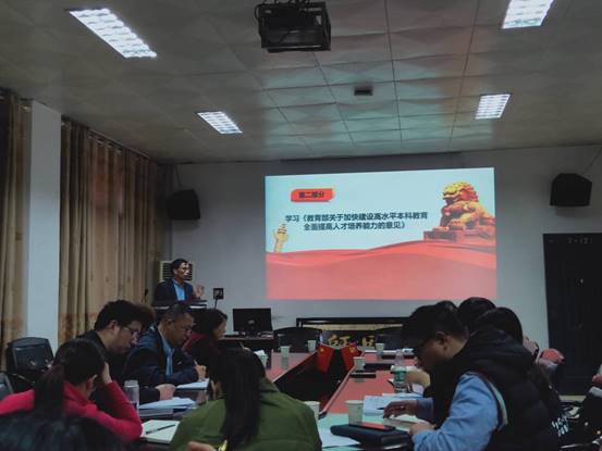 随后,张书记结合学习内容并提出,为扛起国家担当,就要全心全意办好人民满意教育,要认真贯彻执行《教育部关于加快建设高水平本科教育全面提高人才培养能力的意见》的指示精神,希望全体教师不忘初心,牢记使命,坚持办好人人教育的基本原则,坚持立德树人,德育为先,坚持员工中心,全面发展,坚持服务需求,成效导向,提高课程思政意识,把思想政治教育贯穿于高水平本科教育全过程。