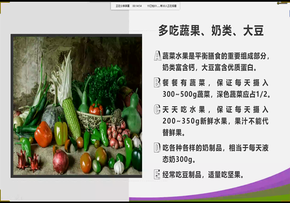 讲座从《中国居民膳食指南(2016)》中的六大核心推荐入手,倡导大家养成以谷类为主,多吃蔬果,丰富食品种类,保持健康体重,增加奶类、大豆等优质蛋白摄入的健康饮食生活方式,强调了健康饮食对提高免疫力的重要作用。同时,讲座结合新冠疫情的特殊背景,根据《新冠肺炎防控期间营养膳食指导》,讲解了各类人群的饮食注意事项及食品采购和储备原则。讲座还重点介绍了牛奶、鸡蛋等优质蛋白的推荐摄入量,强调了分餐制的益处,倡导树立兴新食尚,推广全民分餐制。
