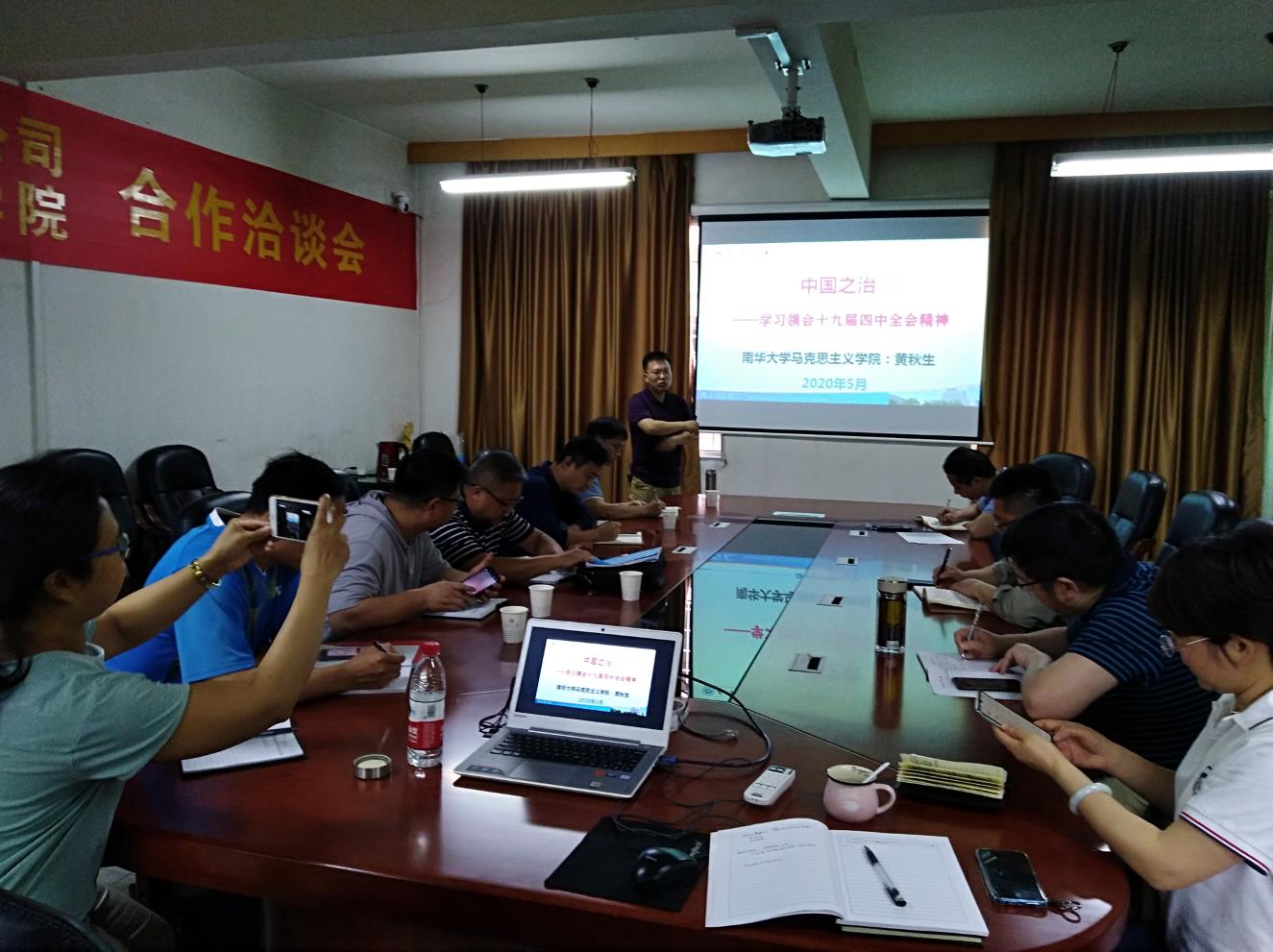 5月22日上午10:30,vsport在院三楼会议室召开公司党委理论学习中心组第二次集中(扩大)学习,公司党委书记张天成、经理龙鼎新及公司党委理论学习中心组全体成员、各党支部书记参加学习,公司理论学习辅导员、马克思主义公司经理黄秋生以《中国之治—学习领会十九届四中全会精神》为题作专题辅导报告,会议由公司党委书记张天成主持。