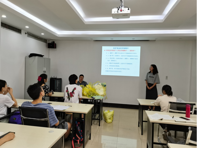 应急办刘富强老师讲授个人防护与卫生处理,2017级卫检实习生普春敏同学回答问题
