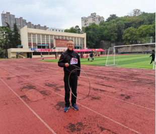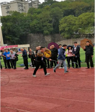 首先进行的是男子滚铁环绕杆预决赛。肖锡林老师,黄波老师,邓仲良老师依次进行了比赛。随着铁环的滚动,我们的心也高高悬起,担心铁环调皮地脱离轨迹,但是老师们都沉着冷静,游刃有余地完成了比赛。