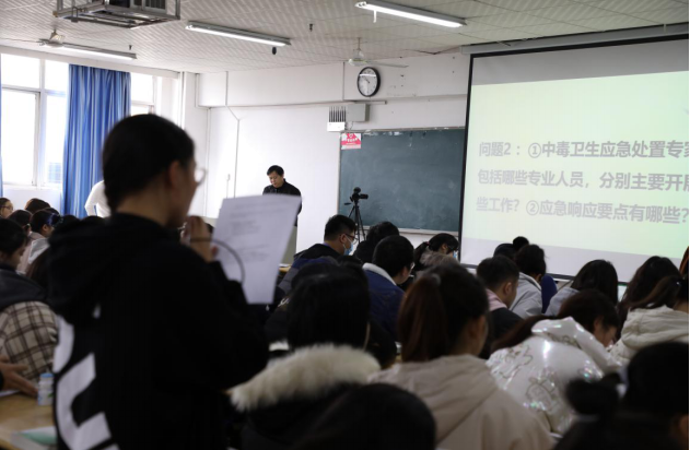 现场座无虚席,梁主任针对预防医学流行病调查的特殊性,结合实际案例内容,带领同学们进行了一次身临其境的案例推演,引发同学们对于现场流行病学的思考与热烈讨论,让同学们对于现场流行病学调查以及食品安全事故的现场处置有了更深刻的认识和了解。
