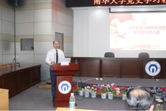 王福俤作了题为《从党史学习教育中汲取砥砺前行的奋进力量》的宣讲,带领全体参会人员深入学习领会了习近平总书记关于党的历史的重要论述,提出要切实增强开展党史学习教育的政治自觉和行动自觉。以团结带领人民实现中华民族的“三大飞跃”为脉络,展开阐述了中国共产党百年奋斗的光辉历程和历史贡献,强调了认真研读党史基本著作的重要性,强调要深刻把握党史学习教育的重点要点,不断从党的光辉历史中汲取砥砺奋进的指挥和力量。最后,王福俤呼吁:“作为南华人,要清晰地把握百年党史与南华发展的联系,深刻感悟百年党史南华篇章的作为与担当!”