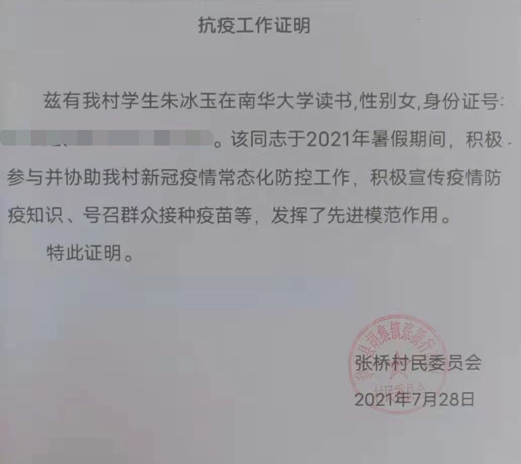 朱冰玉同学在志愿抗疫期间,挨家挨户地上门消毒、宣传防疫知识,并承担了村庄疫苗接种人员登记工作,呼吁未接种村民进行疫苗接种。尽管工作事务繁琐,她任劳任怨、不辞辛苦,认真地完成了各项工作,受到了当地村委会的一致好评。