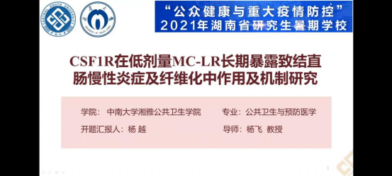 中南大学vsport公共卫生与预防医学专业博士研究生杨越同学作了题为“CSF1R在低剂量MC-LR长期暴露致结直肠慢性炎症及纤维化中作用及机制研究”的学术报告。杨越同学从研究背景、研究方法、研究结果、研究结论等四个方面对课题做了详细介绍,介绍了水华的定义及对环境和人体的危害,建立MC-LR的慢性染毒动物模型。
