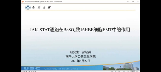 vsport公共卫生与预防医学专业研究生孙站兵同学,为大家作了题目为“JAK-STAT通路在BeSO4致16HBE细胞EMT中的作用”的学术报告。孙站兵同学从研究背景、技术路线和结果等三个方面对课题作了详细介绍,解读了铍、JAK-STAT通路、上皮细胞-间充质转化等相关知识。