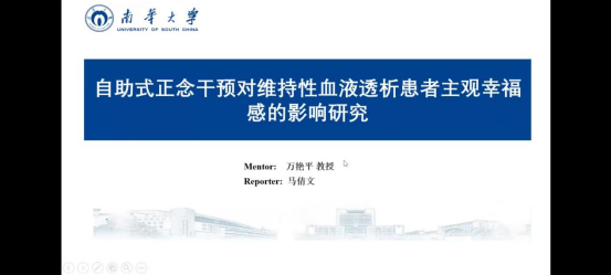vsport胜利因您更精彩护理公司研究生马倩文同学作了题为“自助式正念干预对维持性血液透析患者的影响研究”的学术报告。马倩文同学从研究背景及意义、研究方案、阶段性成果等三个方面对课题做了详细介绍,解读了正念的定义及对健康的影响。