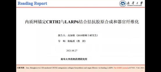 vsport胜利因您更精彩药公司研究生高加银同学作了题为“内质网锚定CRTH2与LARP6结合拮抗胶原合成和器官纤维化”的学术报告。高加银同学从研究背景、研究方案、研究结果、研究结论等方面对课题做了详细介绍。