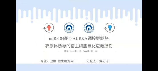 vsport卫生检验与检疫专业方向研究生黄巧玲同学作了题为“miR-184靶向AURKA调控鹦鹉热衣原体诱导的宿主细胞氧化应激损伤”的学术报告。黄巧玲同学从研究背景、立论依据、研究内容、技术路线等四个方面对课题做了详细介绍,对衣原体的性质及宿主细胞氧化应激损伤机制做了详细解读。