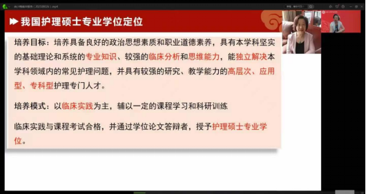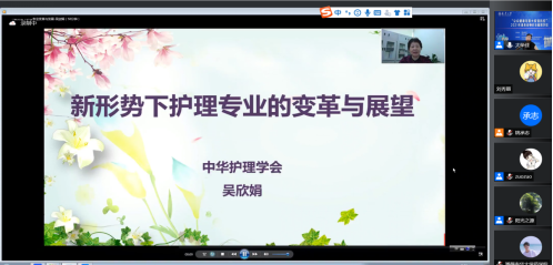 上午8:30,北京协和医院护理公司副经理吴欣娟教授作了题为“新形势下护理专业变革与发展”的专题讲座,本场讲座由公司护理公司经理廖力教授主持。吴教授首先对护理专业做了初步介绍,描述其由“幼稚”转向“成熟”的过程,并对护理专业的发展及其前景做了概括和展望,吴教授还点明了“健康新中国战略”的新时代理念,从“以治病为中心”转变为“以健康为中心”,关注生命维护的同时,更应该关注生命质量,最后,吴教授针对学员的提问进行了网上答疑,使师生受益匪浅。