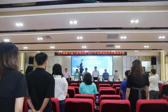 会议第五项,龙鼎新作总结讲话。龙鼎新对本次暑期公司中的工作进行了全面总结,并对支持和帮助筹备本次暑期公司的单位和领导表示感谢,同时也感谢各位专家的精彩报告,感谢老师们和同学们的辛苦付出。正是因为大家的共同努力,本次暑期公司活动得以顺利落幕。会议第六项,全体起立,奏唱校歌。最后,张天成书记宣布2021年湖南省“公众健康与重大疫情防控”研究生暑期公司圆满结束。