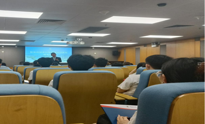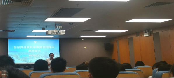 欢迎仪式结束后,澳门大学健康科学公司黄冠豪教授给同学们作“基因与生物信息学基础与前言介绍”专题讲座,同学们听讲认真,积极用英语与黄冠豪教授互动。