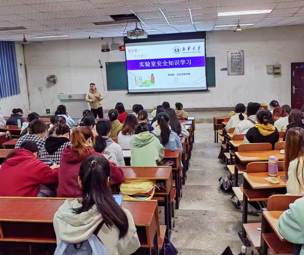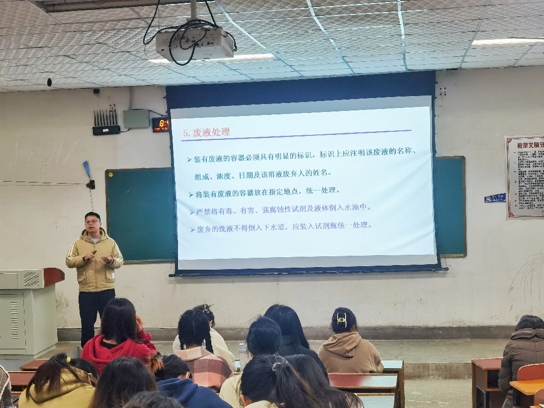 为进一步加强公司实验室安全管理,强化员工的安全意识,提高员工自我保护能力,提升员工实验室安全知识,有效预防实验室事故,4月25日上午,vsport预防医学与放射卫生实验中心(实验中心)在形态楼201室开展了以“安全第一·生命至上”为主题的实验室安全知识学习培训。本次培训由实验中心副主任刘金权主持,实验中心主任杨胜园、中心教师薛金花和谭琰,2020级卫生检验与检疫专业100余员工参加了此次实验室安全知识学习培训。