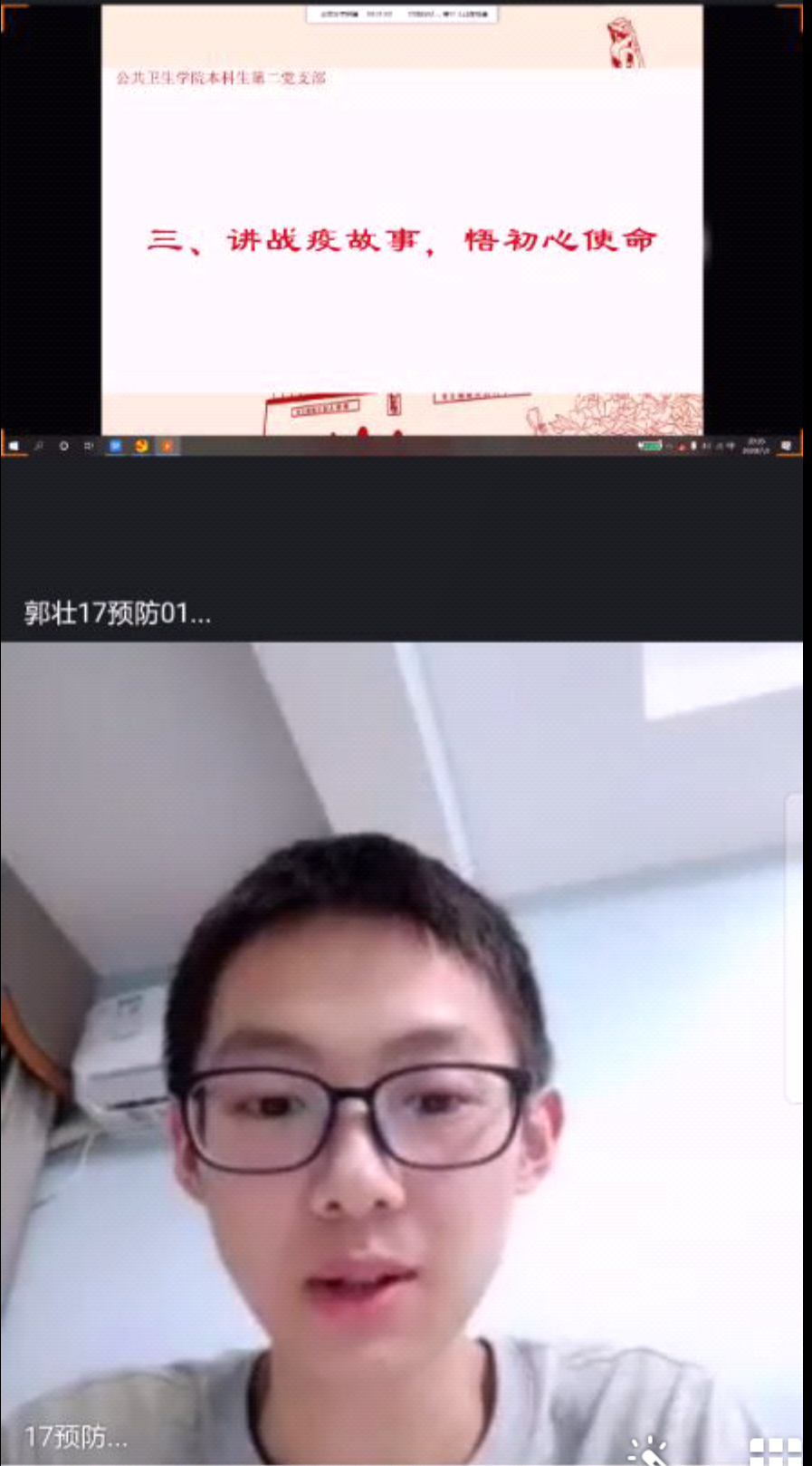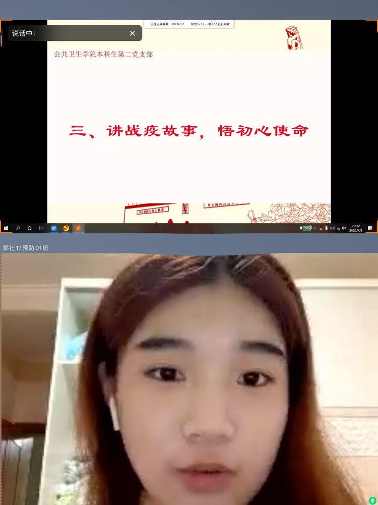 17预防02班的胡恬莎来自浙江温州,疫情期间,温州占据了浙江省一半的确诊患者。为了更好防控疫情,志愿者们不畏惧可能被传染的风险,在简陋的帐篷里检查市民的健康码、测量体温,很多时候凌晨一两点还能看见他们依然坚守岗位。能打赢这场“战疫”,他们功不可没。17卫检01班李晶同志分享了她身边的故事。在疫情爆发初期,各个岗位的党员同志都冲锋陷阵在抗疫的第一线,有警察,有医生,有疾控人员,也有基层干部。李晶同志的姐夫就是抗疫基层干部之一。他是一位年轻的村支书,在疫情爆发初期,负责了全村的物资采购。为了为村民服务,他牺牲了与家人团圆的春节假期,舍小我为大我。