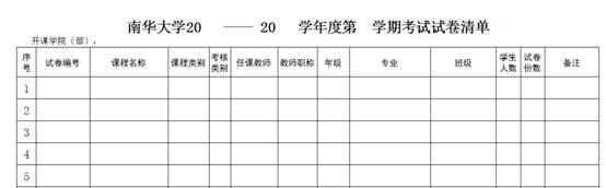 ⑹填写试卷目录清单。对每学年的课程考试试卷信息进行汇总。包括:序号、试卷编号、课程名称、课程类别、考核方式、任课教师、教师职称、年级、专业、班级、员工人数、试卷份数、备注等内容填写《vsport胜利因您更精彩20 --- 20 学年度第 学期考试试卷清单》。(见下表,可从教务在线下载)