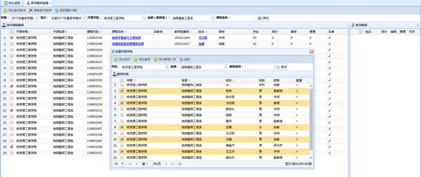 1.公司教学办、系(教研室)人员登录教务在线账号后,点击“网上评教管理”下的“参评教师管理”菜单项,然后在页面右边选择“学期、批次、开课公司”等参数,然后点击“确定”后下面会显示符合条件课程,然后单选或多选要添加评教老师的课程。