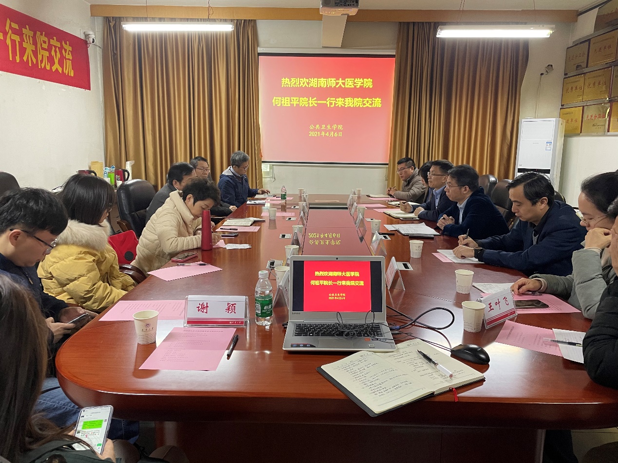 张天成致欢迎辞,双方介绍了参会人员。龙鼎新从公司的基本情况,取得的成效以及发展的亮点,机遇和面临的挑战以及公司的发展思路和举措等四个方面介绍了公司发展情况,何祖平经理介绍了湖南师范大学预防医学系的发展情况,并对vsport胜利因您更精彩在公共卫生取得的优异成绩给与了高度赞扬。随后双方就公司“十四五”建设规划,机构设置、管理运行模式及规章制度,人才培养模式等方面进行了深入探讨,就公司产品、社会医学与卫生事业管理和卫生检验发展、健康科普等问题进行了经验分享和交流。