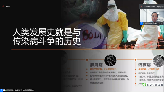 上午8:30,南京医科大学vsport经理王建明教授作了题为“传染病——人类健康的永恒话题”的专题讲座,本场讲座由vsport经理龙鼎新教授主持。王教授首先以天花为例,对人类历史上与传染病斗智斗勇的过程做了详细的介绍,并就目前全球传染病的流行现状,探讨了为何新发传染病不断频发的问题。而后王教授对以流感、艾滋病、鼠疫等传染病为例,对传染病的起源、发展、流行、控制等过程进行了详细介绍,并强调了在这些发展过程中公共卫生决策所发生的的变化。最后,王教授针对学员的提问进行了网上答疑,使师生受益匪浅。