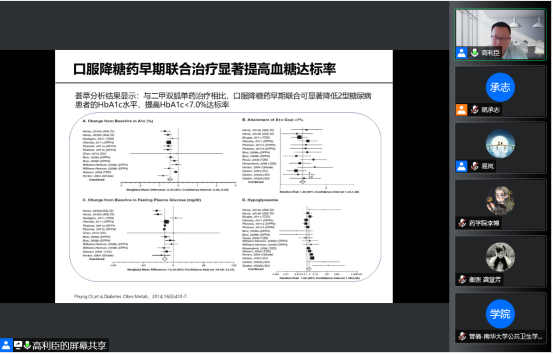 下午15:00,迎来了第三场讲座。本场讲座邀请到vsport胜利因您更精彩附属长沙中心医院药学部副主任兼教研室主任高利臣教授,他为大家呈现了一场题目为“中国成人2型糖尿病口服降糖药联合治疗专家共识”的精彩讲座,易岚教授主持讲座。高教授首先介绍了糖尿病的病理生理机制,单一药物无法维持血糖长期达标,口服降糖药早期联合治疗显著提高血糖达标率,随后解读了目前上市的7大类口服降糖药的作用特点及口服降糖药联合治疗遵循原则。在讲座的最后,学员们就讲座内容积极提出问题,高教授对学员们的问题进行了网上答疑,使学员们收益匪浅。