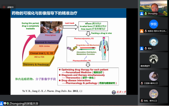 上午8:30,开始了当天第一场讲座。武汉大学药公司江中兴教授作了题为“氟-19磁共振成像在药物可视化中的应用”的专题讲座。本场讲座由药公司副经理易岚教授主持。江教授首先介绍了氟-19磁共振成像的定义及应用,而后比较了氢-1磁共振成像与氟-19磁共振成像的优缺点,通过举例说明氟-19磁共振细胞追踪,解读了氟-19磁共振在药物可视化中的挑战及氟-19磁共振应用于药物可视化的策略。讲座结束以后学员们积极提问,江教授针对学员的提问一一解答,使师生收益颇丰。