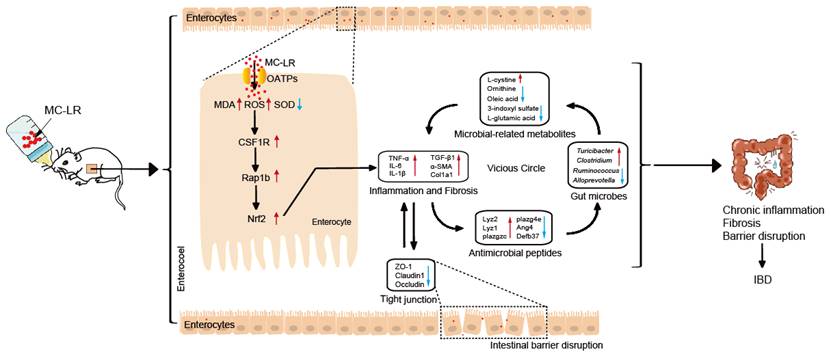 随着水体富营养化以及全球变暖趋势的加剧,蓝藻水华暴发日益频繁。蓝藻水华不仅影响水体景观,产生臭味,而且其分泌的次级代谢产物微囊藻毒素-LR(MC-LR)会造成多器官多系统的损害。我国学者通过流行病学调查,发现血清和饮用水源中的MC-LR与大肠癌的发病率密切相关,但其具体毒性作用机制目前尚不清楚,亟待进一步研究。杨飞教授课题组通过构建低剂量MC-LR长期染毒的体内外模型,率先利用多组学(转录组学、蛋白质组学、16S rDNA及代谢组学)测序技术及体外模型验证发现,低剂量MC-LR可以通过增加活性氧(ROS)生成促进氧化应激反应,上调CSF1R/Rap1b信号通路蛋白表达,导致Nrf2转运入细胞核促进炎症因子(IL-6、TNF-α、IL-1β)及纤维化标志物(α-SMA、TGF-β1、Col1a1)的释放,导致结直肠慢性炎症、纤维化及屏障损伤,甚至可能造成炎症性肠病(IBD)的发生。此外,我们还揭示了MC-LR诱导的炎症反应可通过影响抗菌肽的表达,改变肠道菌群及其相关代谢产物的丰度,从而进一步的加重肠道损伤。