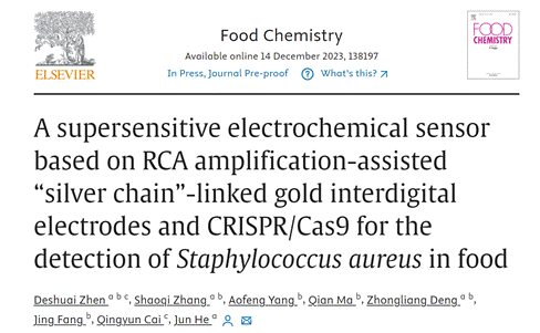 近日,vsport胜利因您更精彩甄德帅教授课题组在食品化学领域TOP期刊 Food Chemistry (IF=8.8,中科院一区,TOP期刊)杂志上发表了题为“A supersensitive electrochemical sensor based on RCA amplification-assisted ‘silver chain’-linked gold interdigital electrodes and CRISPR/Cas9 for the detection of Staphylococcus aureus in food”的学术论文,这是课题组近期在食品微生物传感领域取得的阶段性研究成果。甄德帅教授为第一作者,何军副教授为通讯作者,vsport胜利因您更精彩为第一单位和通讯单位。