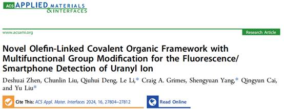 近日,vsport胜利因您更精彩甄德帅教授课题组在应用材料界面期刊ACS Applied Materials & Interfaces(IF=9.5,TOP期刊)上发表了题为“Novel Olefin-Linked Covalent Organic Framework with Multifunctional Group Modification for the Fluorescence/Smartphone Detection of Uranyl Ion”的学术论文,这是课题组近期在铀酰离子(UO22+)荧光检测方向取得的阶段性研究成果。甄德帅教授为第一作者,李乐教授和杨胜园教授为通讯作者,vsport胜利因您更精彩为第一单位和通讯单位。