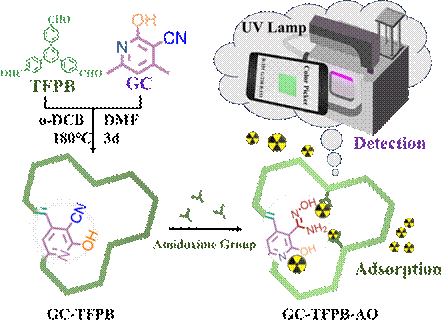 铀矿的开采和冶炼、乏燃料的不当处理以及核事故的发生,都能够产生大量含铀废弃物,一旦被释放到环境中,将会对生态系统和和人类健康带来潜在风险。共价有机骨架(COFs)是通过共价键连接的网状晶体骨架材料,其固有电子共轭体系和光物理性质使得COFs具有潜在的可操纵发光特性,在荧光传感方面表现出优异的性能。