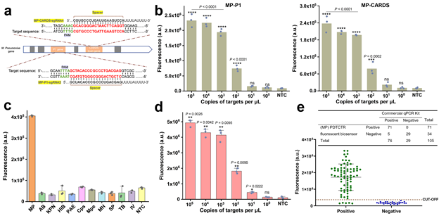 2018年,发现一种新的CRISPR/Cas14a1系统(也称Un1Cas12f1),蛋白分子量小,且对单链DNA的单碱基分辨率较Cas12a更好,能用于单链DNA和RNA检测,但制备单链DNA和体外转录操作复杂,限制了在临床进一步应用。为克服上述挑战,本课题组筛选到最佳的CRISPR/Cas12f1_ge4.1工程化系统,并结合RPA(Recombinase Polymerase Amplification)等温扩增技术,建立一种新型CRISPR荧光传感平台-PDTCTR (PAM-dependent dsDNA Target-activated Cas12f1 Trans Reporter),能在50分钟内快速和灵敏检测肺炎支原体和乙肝病毒,最低检出限为10 copies/μL,较野生型系统灵敏度提高100倍。此外新型的PDTCTR系统具有良好的单碱基区分能力,单碱基分辨的特异性优于Cas12a,能精准鉴别非小细胞肺癌EGFR (L858R)点突变,通过对临床样品进行性能评估,该系统与定量PCR相比有较高敏感度和特异度,分别为93%–100%和100%,凸显其在传染病和癌症相关SNVs诊断方面具有较大应用潜力。总之,PDTCTR系统为分子诊断提供了快速、高效和特异的检测工具,为传染病病原体和肿瘤癌基因相关的SNV精准检测提供新的检测手段和思路。