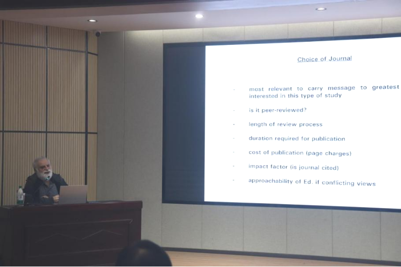为进一步深化校内外学术交流与合作,推进学术国际化,在论文答辩后,Sam教授作了题为“How to write and publish good paper”的学术讲座。Sam教授首先强调了论文写作的重要性,并从论文的构思、撰写以及如何选择期刊三个板块讲述了如何写好一篇文章,同时分享了在论文写作过程中需要注意的一些细节,Sam教授还与台下的听众进行了积极互动,耐心的解答了大家提出的关于“如何在长期的论文写作中保持专注”以及“如何看待AI辅助论文写作”等一系列问题,在热烈浓厚的学术氛围中将本次活动推向了一个新的高潮。