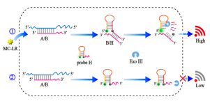 微囊藻毒素-LR(MC-LR)是一种分布广、毒性大、结构稳定的单环七肽蓝藻毒素。长期暴露于低浓度MC-LR可导致多器官损伤甚至生物体死亡。因此,创建高灵敏的MC-LR检测方法至关重要。研究团队构建了一种基于核酸外切核酶(Exo III)扩增的适体传感器,可用于藻毒素MC-LR的现场检测。在检测过程中级联Exo III介导的酶切,能有效提高传感器灵敏度,可检测到0.37 ng/L MC-LR。该方法操作简单,仅需混合不同探针即可完成现场检测。相关成果以“Probe-mediated fluorescent biosensor for MC-LR detection using exonuclease Ⅲ as a signal amplifier”为题发表在国际学术期刊Analytical Methods(Q1)上。vsport23级硕士研究生王宇妍为第一作者,潘家峰和杨飞为共同通讯作者。相关技术已申请中国发明专利。