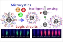 微囊藻毒素亚型的智能化识别与检测有助于精准评估藻毒素暴露导致的健康风险。研究团队以MC-LR、MC-LA、MC-YR为检测目标物,以磁珠为检测平台,结合DNA支点介导的核酸链置换反应,构建了一种微囊藻毒素可视化智能检测技术。这种智能化检测,无需实验室仪器,便于现场快速检测微囊藻毒素浓度并呈现结果,能满足实际样品现场检测需求。相关成果以“Logic Circuits for Intelligent Microcystin Monitoring Based on Aptamer Recognition and Toehold-Mediated Hairpin DNA Self Assembly”为题发表在Analytical Chemistry (Nature Index)上。潘家峰为第一作者,杨飞和陈俊华为共同通讯作者。相关技术已申请中国发明专利。