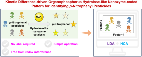 在农业生产中,有机磷农药(OPs)的广泛应用对人类健康和环境构成了巨大威胁,制定方法和工具区分各种OPs对于保障食品安全和绿色环境至关重要。近期,牛湘衡团队首次将具有类磷酸酶活性的纳米酶与传感器阵列结合,提出了基于动力学差异的水解策略。在相同反应条件下,五种常见的OPs类似物(甲基对氧磷、对氧磷、甲基对硫磷、对硫磷和杀螟硫磷)具有不同的催化特性和动力学差异,利用超小的CeO2纳米颗粒作为唯一传感单元,通过催化水解反应产生不同的颜色信号,由此构建传感器阵列,通过线性判别分析(LDA)和层次聚类分析(HCA)实现对硝基苯类农药的识别和定量(图1)。提出的方法具有良好的抗干扰性能,能够有效克服传统酶抑制法和以前报道的纳米酶传感器的局限性。此外,验证了方法在真实样本中的有效性,展示了其在复杂基质中进行多靶标高通量检测的潜力。