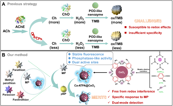 在食品安全备受关注的当下,农残检测已成为守护公众健康的重要防线。氧化还原纳米酶已被广泛研究用于检测农残,但存在易受氧化还原物质干扰、检测特异性不足等局限。近期,牛湘衡团队研制出一种荧光水解纳米酶(Ca-ATPA@CeO2),联合双活性位点协同催化信号放大、双重信号相互验证、无氧化还原干扰等特性,实现了复杂食品基质中甲基对氧磷的特异性检测。通过钙离子与二氧化铈的协同催化作用,实现将目标农药快速水解转化为黄色对硝基苯酚,同步触发纳米酶自身荧光信号淬灭,从而建立比色(颜色变化)与荧光(强度衰减)双模态交叉验证方法(图1)。该方法可有效克服基质中氧化还原物质的干扰,且通过双信号互证机制显著增强检测结果的可靠性。