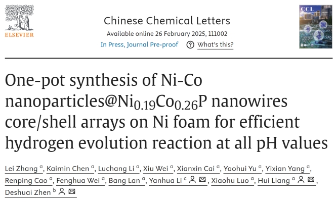 近日,vsport胜利因您更精彩甄德帅教授课题组在国际知名期刊《Chinese Chemical Letters》(中科院1区, Top, IF= 9.4)杂志上发表了题为“One-pot synthesis of Ni-Co nanoparticles@Ni0.19Co0.26P nanowires core/shell arrays on Ni foam for efficient hydrogen evolution reaction at all pH values”的学术论文,这是课题组近期在水资源利用、新能源领域取得阶段性进展。甄德帅教授为通讯作者,vsport胜利因您更精彩为通讯单位。