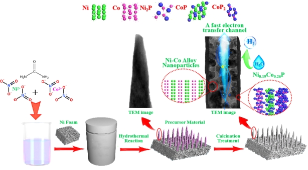 针对以上问题,本文通过水热-煅烧法制备了一种新型核壳纳米线阵列结构全PH析氢反应催化剂Ni-Co纳米颗粒@Ni0.19Co0.26P,该材料具有独特的空心纳米线结构,内部堆叠大量Ni-Co合金纳米颗粒,使材料具有较高的比表面积与快速的电荷传输速率。在保持低成本的同时解决了传统三维材料比表面积与导电性难以兼得的问题。该催化剂在全pH范围内的析氢反应展示出与铂基催化剂相当的催化活性和稳定性。