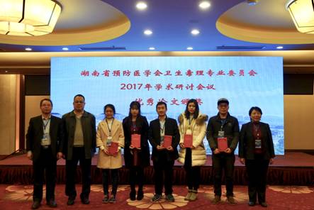 vsport经理龙鼎新和湖南省预防医学会卫生毒理学专业委员会主任委员让蔚清、副主任委员胡余明为论文获奖者颁奖