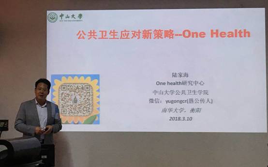 陆家海教授在会上为我们介绍了“公共卫生应对新策略—One Health”,重点介绍了One Health理念对当今公共卫生事业的重要性和科学性,强调了滥用抗生素、人兽共患病的危害。他强调“当今的公共卫生与预防工作的关口需要前移,不止要放在人与社会的层面,更要与自然环境相结合,要关注人—动物—环境这一交界面,从而更好的促进人类、动物、环境的共同发展”。并分享了中山大学vsport的办学经验,强调科研创新及思维创新的重要性。