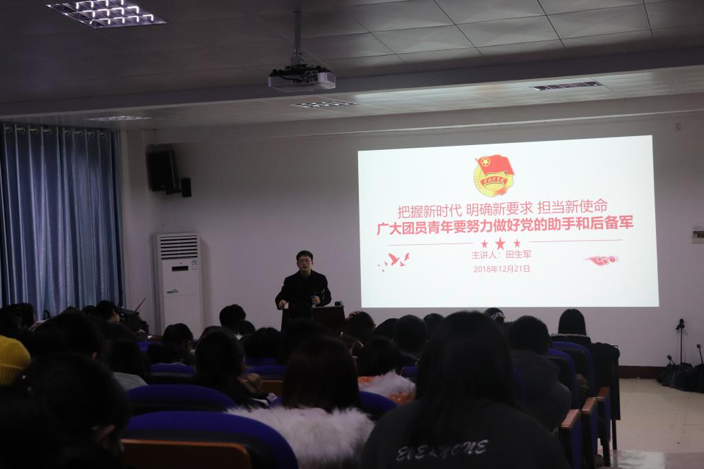本次团课以“把握新时代、明确新要求、担当新使命,广大团员青年要努力做好党的助手和后备军”为主题,结合党的十八大、十九大以及团的十八大精神,全面阐述了新时代、新要求、新使命的内涵及意义。田书记主要围绕以下三个方面进行讲述:第一,习近平总书记7月2日在中南海同团中央新一届领导班子成员集体谈话的讲话精神。第二,习近平总书记9月10日在全国教育工作大会上的讲话精神。第三,十八大以来,习近平总书记多次通过演讲、座谈等方式寄予青年的讲话精神。