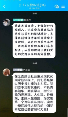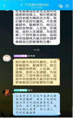 17级卫检因实习原因均采取线上会议的形式,在班级群发起讨论,大家积极学习习近平主席在湖南考察调研时对青年的学子的勉励:“不负青春、不负韶华、不负时代”,并发表自己的理解,17卫检02班的李莎同学就说到“认真学习了习近平总书记的讲话,明白了我们广大青年一定要坚定理想信念,功崇惟志,业广惟勤。理想指引人生方向,信念决定事业成败。没有理想信念,就会导致精神上‘缺钙’。中国梦是全国各族人民的共同理想,也是我们青年一代应该牢固树立的远大理想。”