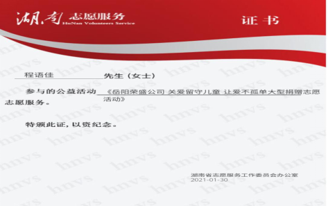 寒假期间,程语佳同学主动参与了公益活动《岳阳荣盛公司关爱留守儿童让爱不再孤单大型捐赠志愿活动》志愿服务,于家乡芋头田社区儿童服务站为留守儿童们提供服务、送出温暖。她与留守儿童们一起玩耍,给他们发放爱心礼品。语佳在小朋友们的开心面容和感谢声中备受感动。她决定以后经常参与留守儿童相关的公益活动,帮助留守儿童学习、为他们建立积极乐观的生活态度,助他们健康成长,助他们向更美好的人生迈步!