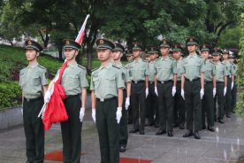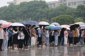 在蒙蒙细雨中,升旗仪式正式开始。在全体师生的注目礼中,鲜艳的五星红旗随着嘹亮的国歌冉冉升起。