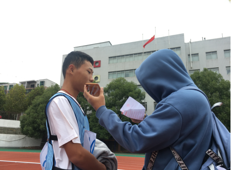 比赛前胡隆奎同学并不紧张,表现地十分镇定,看上去十分有信心。在试跳时胡隆奎同学便轻松跳过。在第一次起跳时胡隆奎同学虽然失误了,但在第二次成功跨栏。田径场上风力强劲,却没能影响胡隆奎同学发挥。