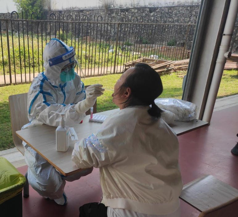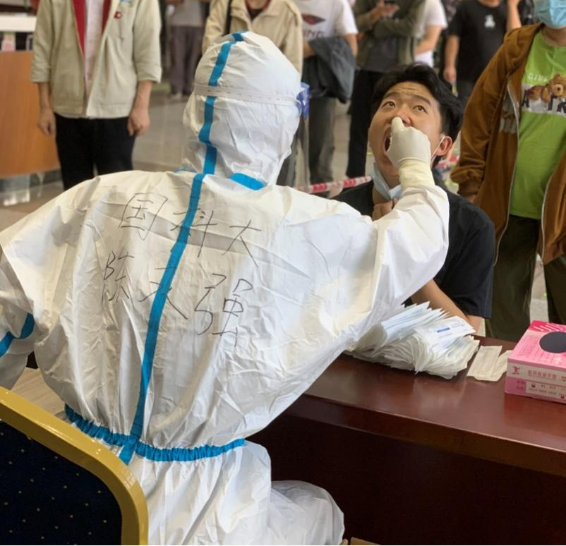 起初,身为实习生的他们对防疫工作充满了好奇,更多的是想体验一线医务人员的工作状态。可是当他们穿上防护服的那一刻,密封的衣服、紧束的KN95口罩、眼罩等装备,让他们全身上下的毛孔都无法呼吸。第一次采样过后,他们全身的衣物都被汗水浸湿。这次采样,也让他们深深体会到了医务人员的艰辛,难以想象在高温的夏日医务人员是如何度过户外核酸采样的。在这之后,拥有了操作经验的他们动作逐渐娴熟,他们也正式加入采样小组,参与每一次的采样工作。令他们印象最深的是,有一天的采样工作从下午5点进行到晚上11点,长时间重复的机械动作使他们都感受不到夜色已深。对陈永强和肖勇泰来说,每天最放松的时刻不是脱下防护服,而是每一次的工作后都能让他们感觉自己真正地为社会做了贡献,在那一刻,所有的疲劳都被幸福感和满足感冲散。