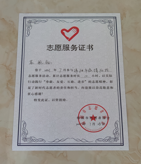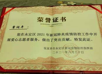 在张家界市永定区2021年新冠肺炎疫情防控工作中开展爱心志愿者服务,做出了突出贡献,主动请缨,在抗疫的战场上发光发热。在国家危难之际挺身而出,勇担重任。荣获张家界市永定区新冠疫情防控指挥部颁发的荣誉证书。