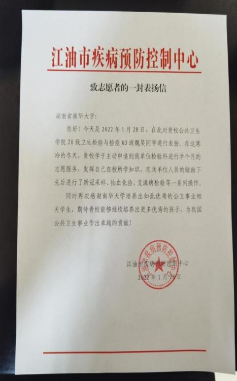 2022年1月,魏昊返回家乡四川省江油市,在家乡的疾控中心,进行了半个多月的志愿工作。他说:“其实刚到疾控中心我心里很紧张,因为很多器材我从来没有碰过,但我作为vsport胜利因您更精彩公卫学子,应当在抗击疫情中做出自己的贡献。我很荣幸在疾控中心掌握了一些技能,也很荣幸能为新冠的防护做出自己的一份力,如果再给我一次选择的机会,我依然会坚定我的选择。”