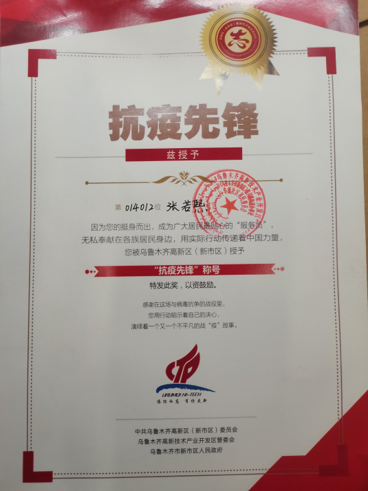 在中共乌鲁木齐高新区(新市区)委员会抗疫行动中,张若熙同学负责对出入人群进行身份登记,体温测量和检查健康码行程码,确保进入社区的人没有异常。对于居家隔离的人员,她每日去询问他们生活所需,帮他们采购生活用品,解决困难,营造一个舒适的隔离环境。对于返乡人员,她帮助社区向疾控中心汇报,严格排查中高风险地区返乡人员。